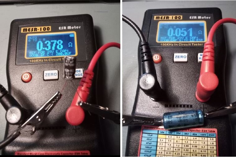 Na sledećoj slici, lijeva slika, mjeri se kondenzator 47uF namijenjen “širokim narodnim masama”. ESR iznosi 0.378 oma i po referentnoj vrijednosti je ispravan ako se radi o kondenzatoru čiji je kapacitet manji od 200uF. Znači i ovaj je dobar.