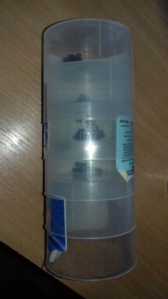 Prilikom rasklapanja TV-a šrafiće selektujemo,po fazama rasklapanja u odvojene posude.Ali desi se ponekad da posuda ispadne.Rešenje su potrošene mekane plastične kutije od štapića.Idu jedna u drugu i ostaje oko 3cm prostora.Dovoljno za razne šrafiće i manje plastike.Dobijeni toranj zauzima malo mesta,može da ispadne,da se skloni sa stola bez gubitka redosleda sklapanja.I takođe bitno,nema viška srafića ili plastika kad se sklopi TV jer je prvi nivo pri sklapanju gornji,pa svaki sledeći nivo prati fazu sklapanja.