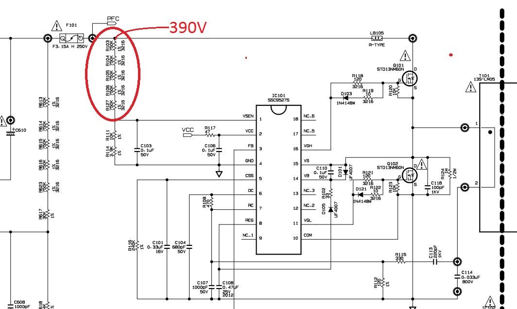 A u ovom slucaju PFC pravi ovaj segment pri cemu je generator IC601. koji uz pomoc ovih T603, 604 drajva ovaj par MOSFET transistora te preko zavojnice i na kraju diode dize na potrenih 385 ili malo vise volti.