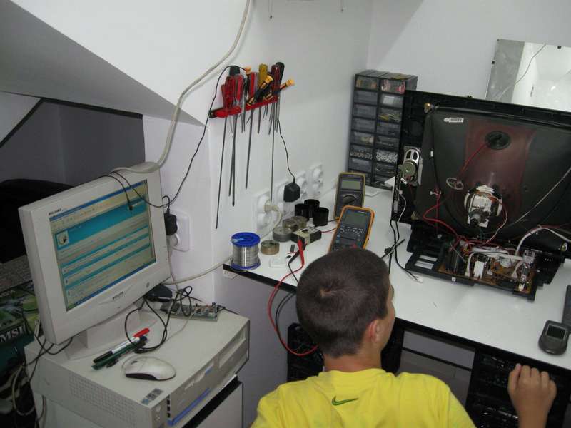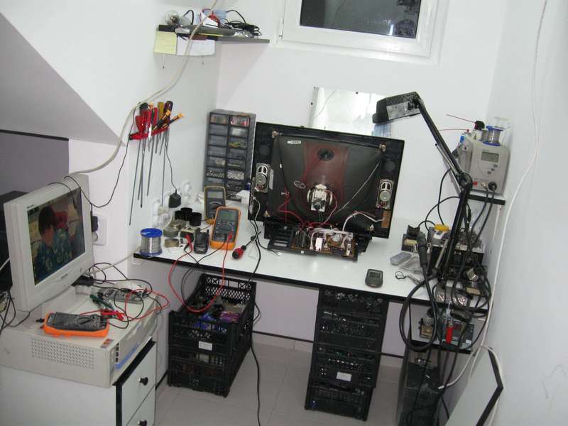 To je glavni sto za popravku televizora. Tu se najviše radi.
