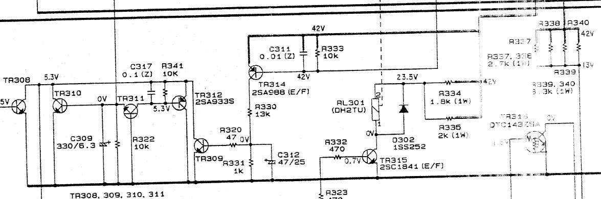 U pojacalu su neispravni TR306, TR322, ZD302 (vide se na slici). Vidim da ti elementi pripadaju negativnoj grani napajanja. Medjutim video sam da nemam izlazne napone ni +15.5V, kao ni -15.8V. Sporni tranzistor DTC143Z sam skinuo i izmerio, i dobio sledece vrednosti: Spoj baza-kolektor kao i baza-emiter 5.8k, kolektor-emiter 50 oma (?). To mi se nikako ne cine odgovarajucim vrednostima zar ne? Ako sam dobro shvatio, izmedju baze i emitera bih trebao da imam otpor 4.7k+47k, tj nekih 52k. Izmedju kolektora i emitera ne bi nikako smeo da ima 50 oma ako sam sve razumeo kako treba... Sutra bi trebali da mi stignu svi delovi, pa cu da vidim sta se desava.