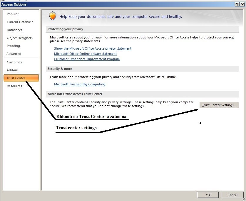 Da ne bi stalno prilikom pokretanja aplikacije iskakao prozor "Security Notice", možete u MS Access-u to podesiti na sledeći način.