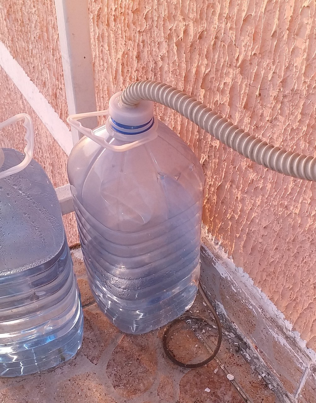 Kada nakapa voda u flaši preko pola,tj nekih 15cm iznad visine crevceta stvori se dovoljan pritisak da "potjera" vodu kroz crevo 5mm i odtekne sva voda u oluk.Kad jednom krene ne staje do donjeg nivoa,pa onda ponovo ne curi dok ne nakapa približno da iste visine(istog pritiska).I voda ima napon.Taj ciklus nikad nije omanuo niti se začepilo crevo od 5mm mada se vidi na slici da je potpuno pocrnilo i štrokavo.Na početku sezone stavim novu flašu i ne izlazim više da prosipam vodu,a nakupi se (dok nisam ovo uradio) po 5 flaša dnevno kad su vrućine i vlaga.