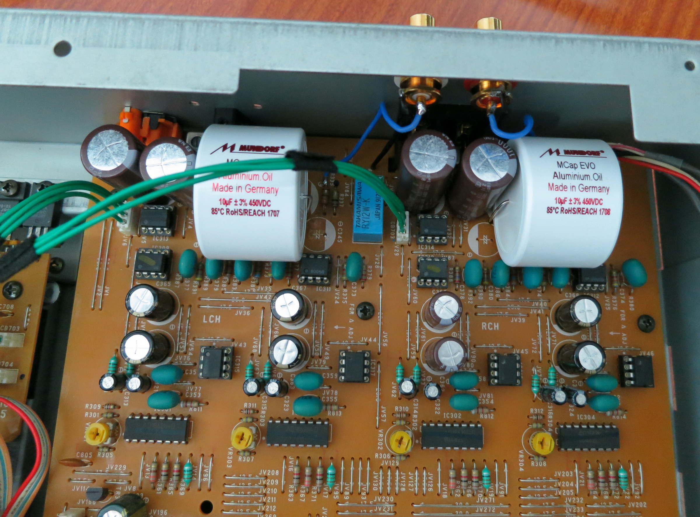 U izlazu ima po 4 elektrolita, po dva redno, pa paralelno. Tu treba staviti opet SILMIC II, ali samo dva umesto 4 ili još bolje neki bolji MKP blok 15µF. Izbor je veliki i cene jako različite. Ovde je prethodni vlasnik već stavio takve, tako da će to da ostane tako. Od prihvatljivih mogu taj kod mene ICEL, ili nešto bolji MUNDORF. Cena oko 8-12€ p komadu.