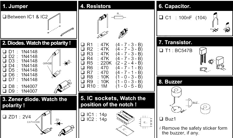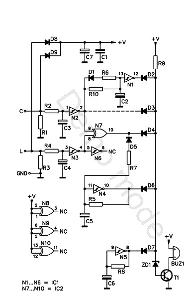 Da bi pronasao zasto ti ne radi predlazem sledece. Otkaci jedan kraj dioda D6, D4 i D2 (d3 se ne ugradjuje) i uklljuci uradjaj. Plus dovedi na bilo koji izvod (C ili L) U ovom slucaju radi samo oscilator N5 i mora se cuti zvuk iz zumera. Ako se ne cuje trazi kvar tu. Ako dobijes ton onda vracaj jednu po jednu diodu. Kad prestane da pisti, opet trazi kvar oko te diode, odnosno kola na koje ide ta D