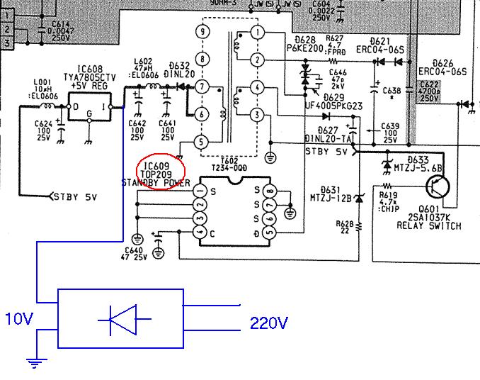 Sine mi ideja. Zasto ne bih ugradio privremeno obican ispravljac 10V i zavrsio posao. Tako je i bilo. Ugradim obican "pijacni" ispravljac i povezem kao na slici. Cak nista nisam ni skidao. Aparat proradio kao da mu nista nije bilo.